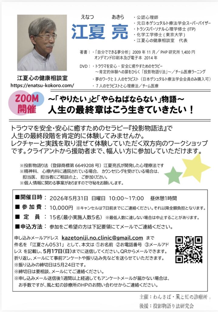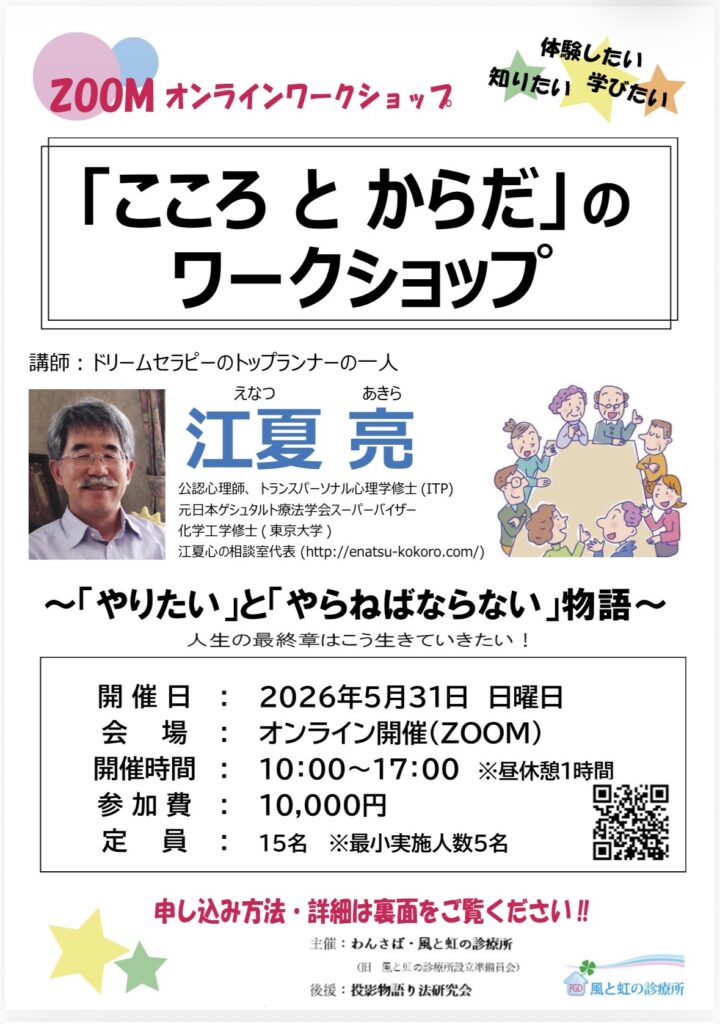 ※2026年5月24日(日)に予定していた 「こころ と からだ」のワークショップ~やりたいとやらねばならないの物語~(zoom) は